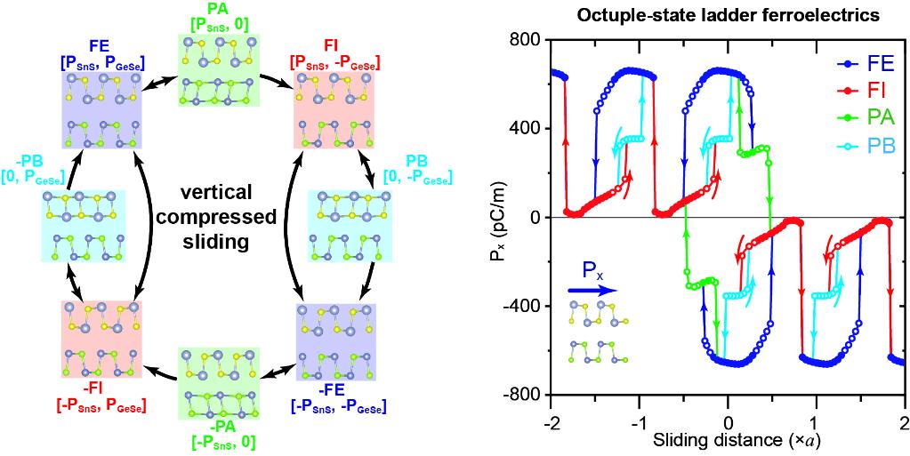 近日,必赢242net官网强度室的邓俊楷教授同澳大利亚墨尔本大学刘哲教授合作,在双层GeSe/SnS范德华异质结中,发现了由面外压缩和层间滑移协同诱发的多级铁电相变和八种极化态阶梯铁电现象。研究团队利用极化大小不同的GeSe和SnS两种IV-VI族二维铁电材料,构筑了双层范德华异质结,并形成了稳定铁电相和亚铁电相。研究发现,通过面外压缩应变条件下的层间滑移,层间范德华相互作用能和层内变形弹性能之间相互竞争,促使类黑磷烯褶皱结构的GeSe和SnS分别向一种新的倾斜型顺电结构转变,从而诱发了两种具有不同极化状态的中间相。铁电相和亚铁电相可以通过这两个新相为媒介互相转换,实现铁电-亚铁电相变。最终,铁电相、亚铁电相和两个新相之间可以通过层间滑移引起的多级相变相互转变,形成一个闭合的循环路径,产生共八种不同的极化状态,极化的大小呈阶梯状递增,因而称为“阶梯铁电”现象。八种极化态现象是双层二维材料中目前已知的最多极化状态,为设计新型多态铁电材料提供了一种新的思路,有望应用于未来的铁电信息存储技术。