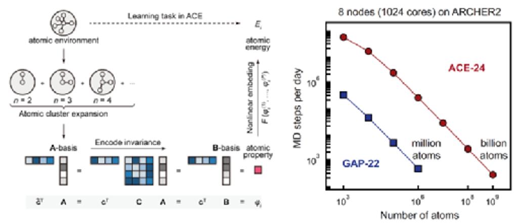 为攻克这一难题,必赢242net官网金属材料强度全国重点实验室材料创新设计中心(CAID)与牛津大学研究人员开展合作,开发了一种基于“原子簇扩展”(Atomic Cluster Expansion, ACE)框架的超快机器学习势函数。该工作建立在团队前期开发的GST-GAP机器学习势函数的基础之上(Nature Electronics 2023, 6, 746–754),通过引入ACE框架和额外的领域特定数据集迭代流程,使得新的GST-ACE势函数在不损失原子受力与运动精度的前提下,将模拟效率进一步提升,达到GST-GAP的400多倍,可支撑百万原子纳秒级或十亿原子皮秒级的分子动力学模拟。