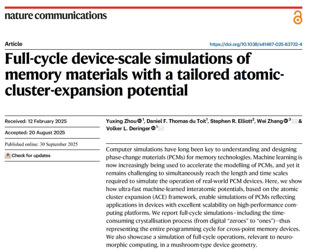 2025年9月30日,《自然·通讯》(Nature Communications 2025, 16, 8688)发表了题为“相变存储材料量专用原子簇扩展机器学习势函数及其全周期器件尺度模拟”(Full-cycle device-scale simulations of memory materials with a tailored atomic-cluster-expansion potential)的研究论文。该研究在器件尺度原子级模拟领域取得了重要进展,为研究和设计下一代相变存储技术与类脑计算芯片提供了重要的理论工具。