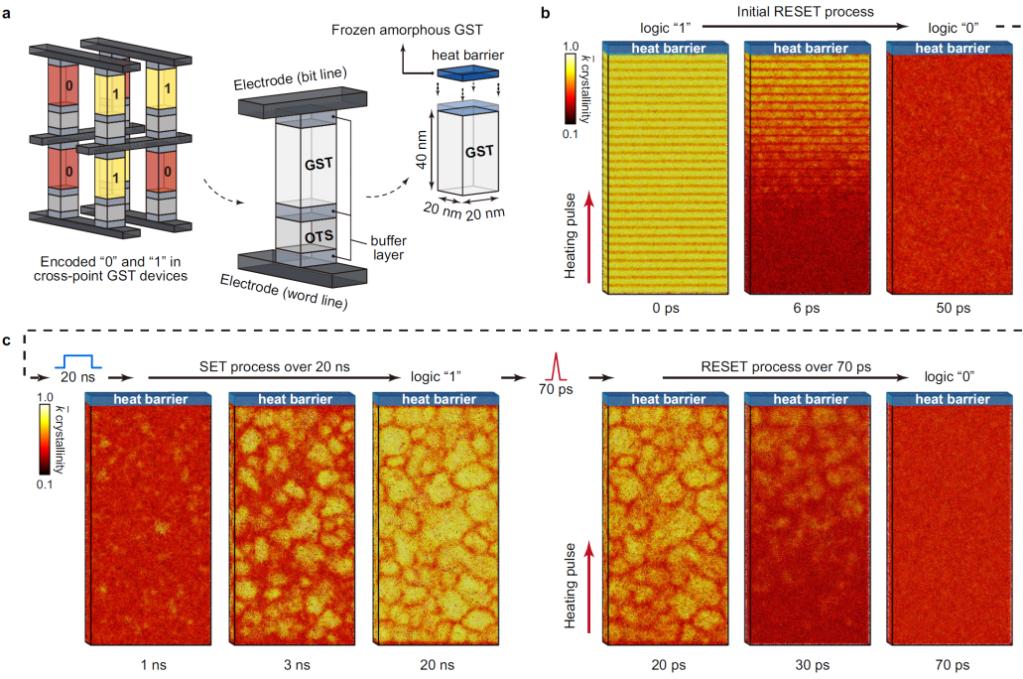 商用相变存储器利用锗锑碲合金非晶相(低电导,逻辑态“0”)与晶体相(高电导,逻辑态“1”)之间的电阻差异实现数据存储。如何进一步优化器件结构与相变单元体积是相变存储芯片技术更新迭代的关键。以英特尔的“傲腾”芯片为例,其相变存储芯片单元的特征尺寸为20 nm * 20 nm * 40 nm,含超53万原子,远超第一性原理分子动力学的模拟极限。模拟存储单元在纳秒级时间尺度和百万原子级空间尺度下完整读写循环一直以来都难以实现。