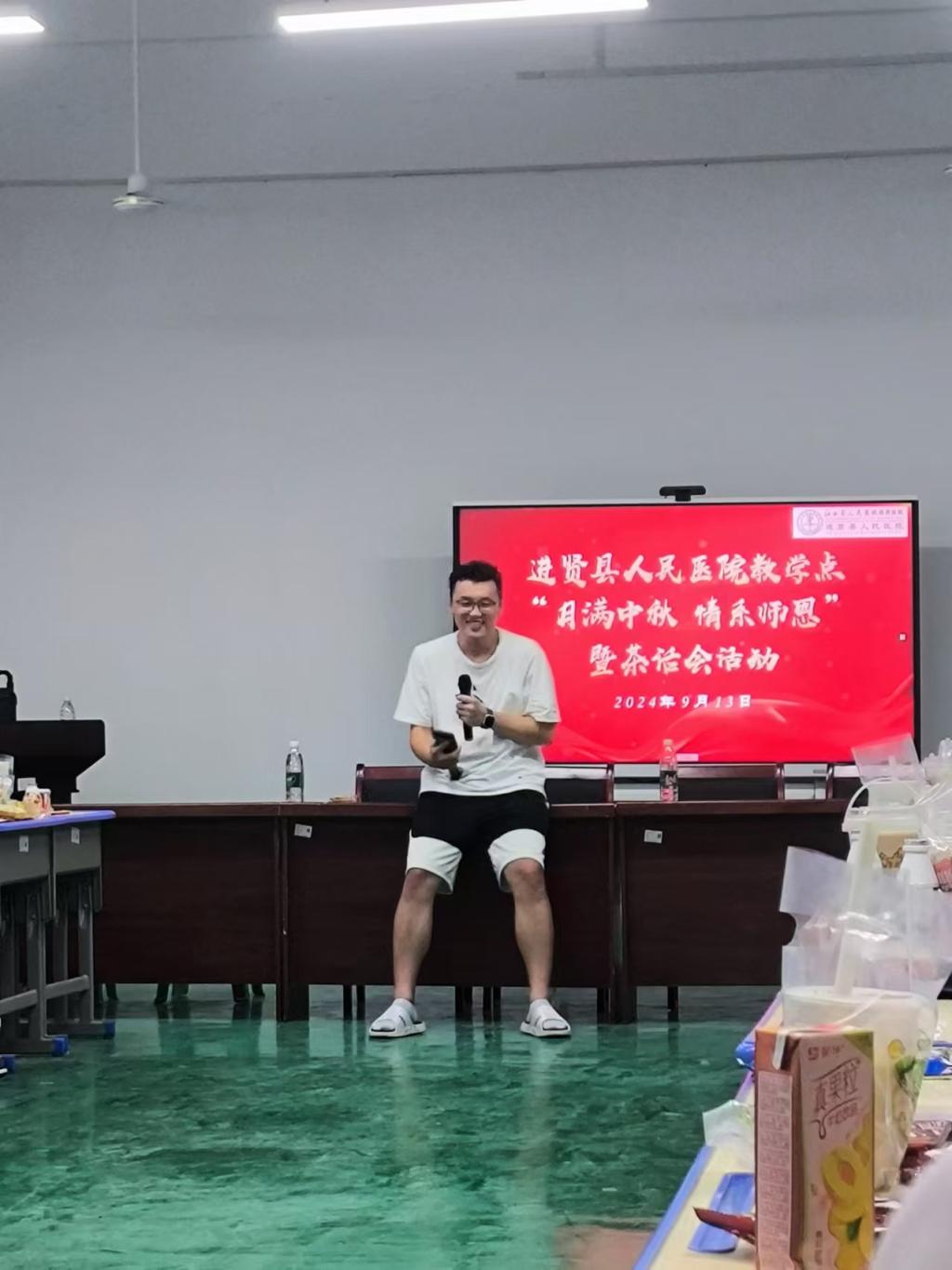 进贤县人民医院院长李国民、医院科教科负责人、班级辅导员等与同学们欢聚一堂,共话中秋,畅想未来。活动伊始,李国民院长代表医院向全体向同学们致以节日的问候和祝福,随后李国民院长以一位医院管理者、医学生学长、医学生家长的身份向同学们传道授业,帮助同学们更好、更准地把握自己未来人生的方向。随后进入到娱乐环节,同学们载歌载舞,尽情地展示各自的才艺。在激动愉快的击鼓传花的游戏中,我们结束了这一愉快的盛会。