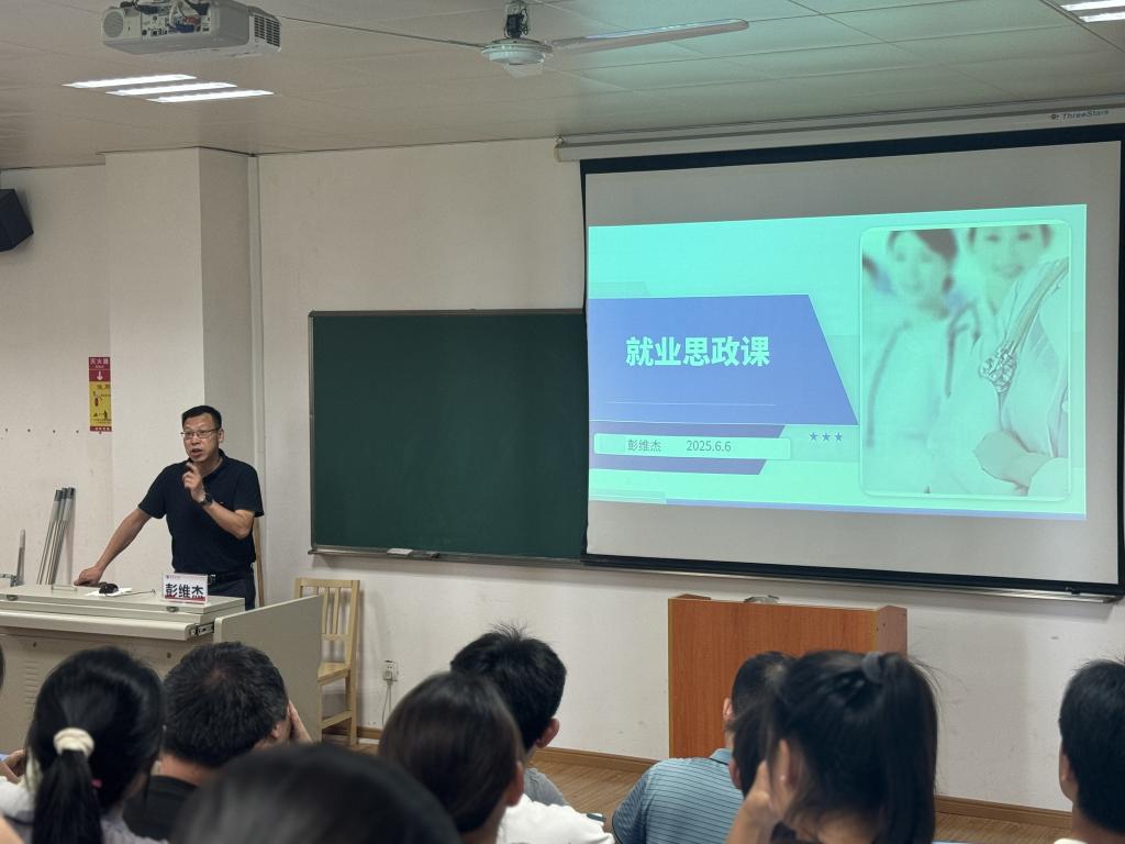 6月6日下午,学校1号实训楼5楼多媒体教室内座无虚席,气氛热烈。校党委副书记彭维杰为伟德victor1946网站2025届毕业生代表及低年级学生骨干,讲授了一堂立意深远、鼓舞人心的就业指导与思想政治教育融合课。面对当前就业工作新形势,彭维杰将深邃的思政引领与务实的就业指导熔铸一炉,为护理学子廓清迷雾、校准航向。