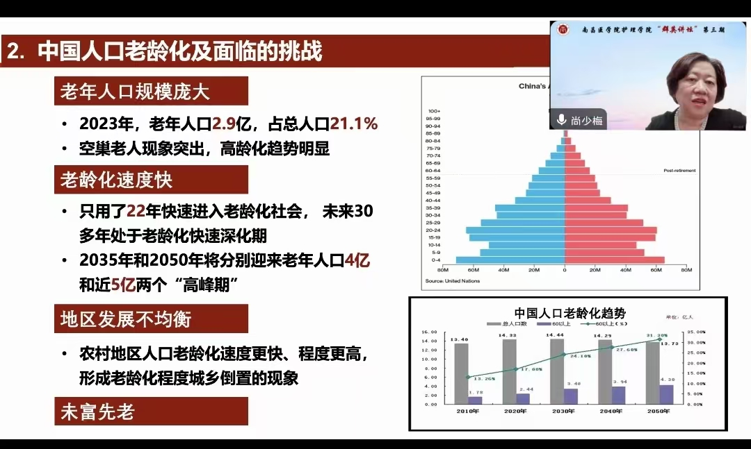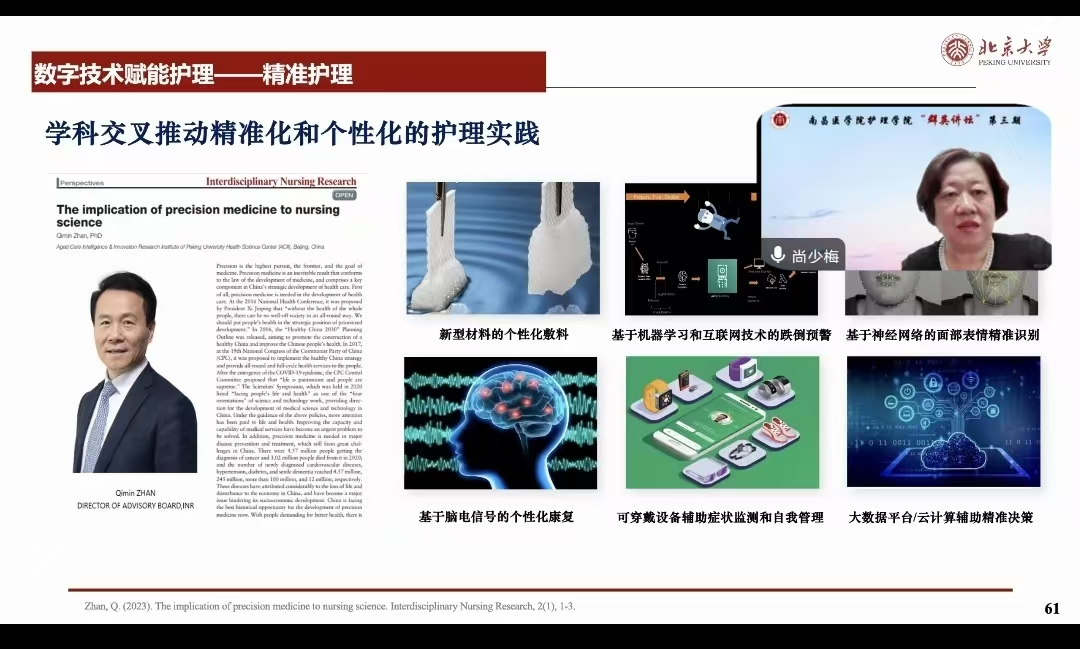 随后,北京大学伟德victor1946网站院长尚少梅教授以《大数据驱动下护理研究热点》为题作学术报告,为我们梳理了2013年至2023 年近十年间护理领域和护理大数据的热点频词,并从数字技术赋能护理、科技部在老年领域的研究布局、数字技术在智慧康养领域的应用等方面进行讲解,启迪护理人员利用人工智能、大数据模型开拓护理研究新思路。整个讲座内容丰富、通俗易懂、精彩生动,既有理论高度,也具有很强的指导性和操作性,对我院今后持续提升教师科研能力和科研服务水平起到了积极的指导作用。